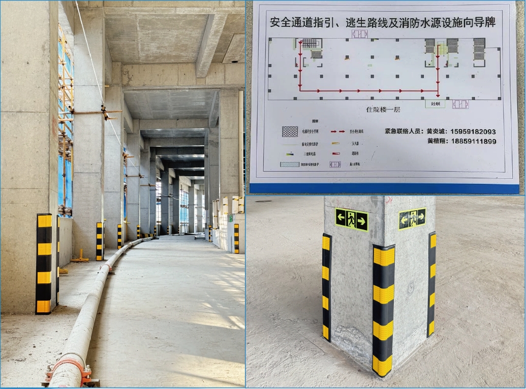 在員工通道入口設置感應式廣播,提醒人員入場佩戴安全帽、穿好反光衣等。采用廣播形式在樓層內進行安全知識宣傳,循環播放,時刻進行安全警示。安全通道結合現場結構走廊,利用反光角條、疏散標識突出顯示安全通道,并在樓層主要出入口張貼安全通道指引、逃生路線及應急設施向導牌,張貼緊急聯系人等,暢通生命通道。為防止后澆帶支撐拆除后回頂的情況發生,項目部提前策劃地下室通行路線,在后澆帶支撐搭設階段,采用工字鋼轉換層作為預留通道洞口模板支撐的基礎。