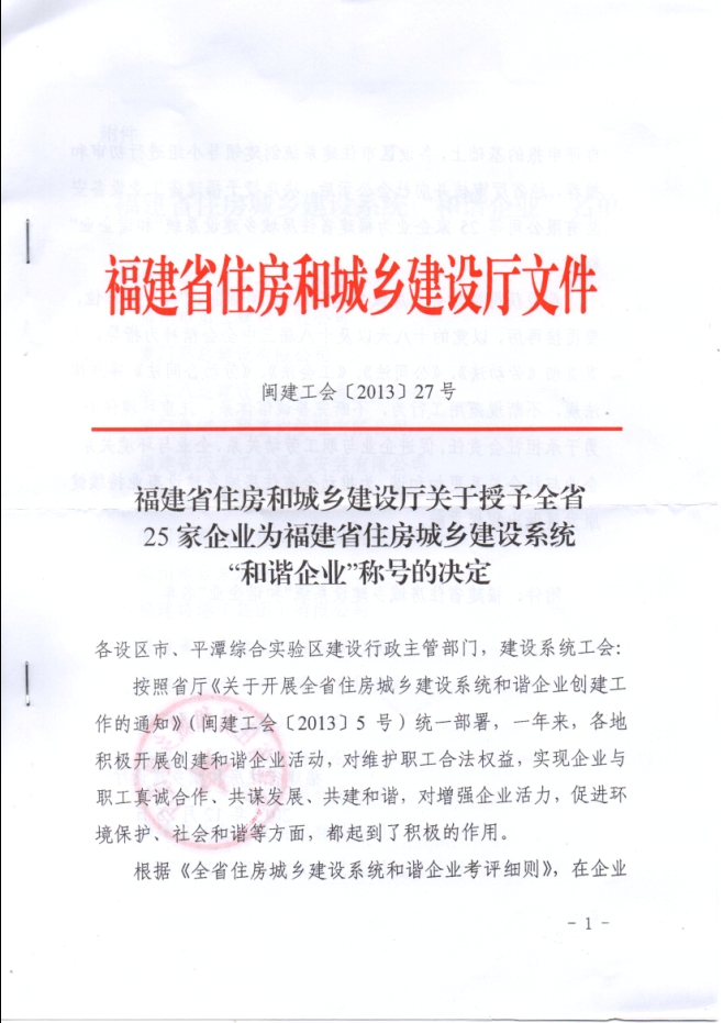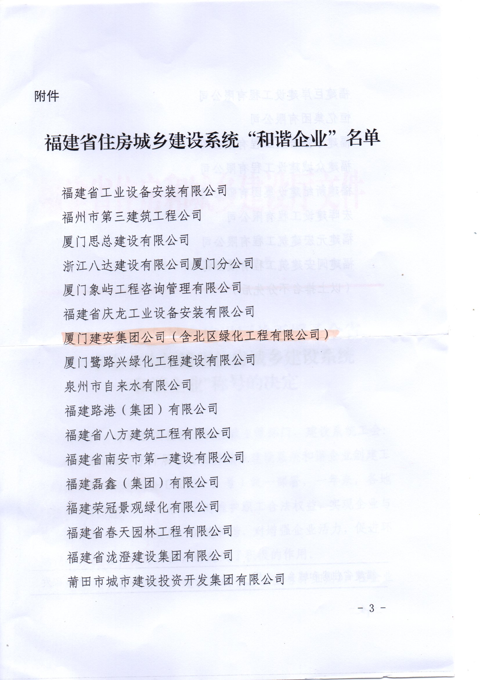 公司(含北區綠化工程有限公司)被福建省住房和城鄉建設廳授予福建省住房城鄉建設系統“和諧企業”稱號。